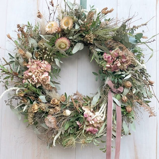 A variety of dried flowers, dried fruit, fresh flowers, both fresh and dried native greenery, gum nuts, ribbons, grasses, and wreaths are arranged on a 40cm rattan base.